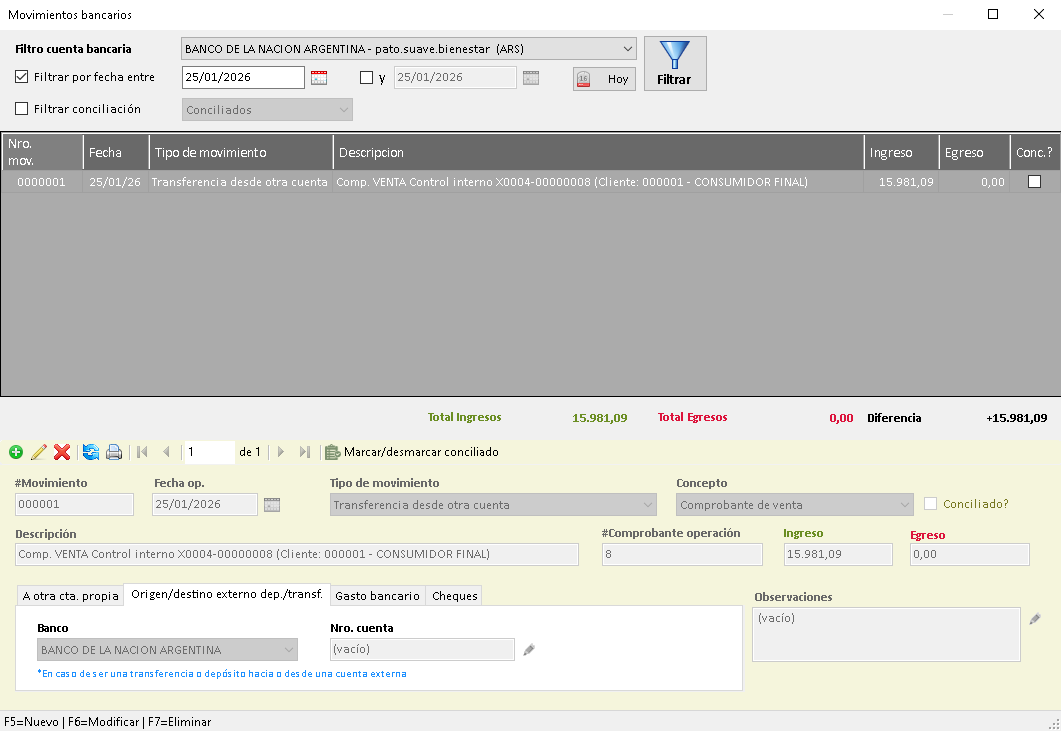 - Movimientos bancarios separados por cuenta bancario